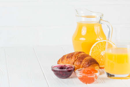 Freshly baked croissant, orange juice, fresh fruits, jam on white wooden background. French breakfast. Fresh pastries for morning. Delicious dessert. Closeup photography. Horizontal banner.