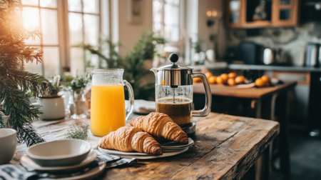A cheerful breakfast spread featuring fresh croissants, orange juice, and coffee on a rustic table. The warm sunlight creates a cozy atmosphere in a welcoming kitchen.