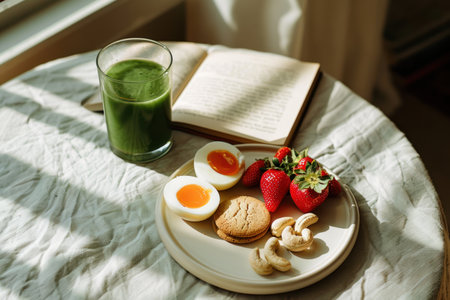Homemade simple breakfast on kitchen table, green smoothie and boiled eggs, some strawberry, linen retro tablecloth, elevated luxurious morning everyday routine, closeup photo, AI generated
