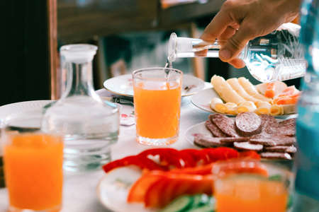 High angle on table with dessert, orange juice and marmalade during breakfast. Real photo