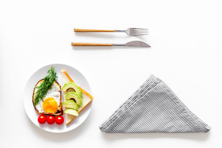 Healthy hearty breakfast. Fried eggs with vegetables near toast with avocado on white background top view copy space