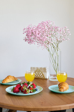 A Beautifully Elegant Breakfast Scene Featuring Fresh Fruits and Beautiful Flowers