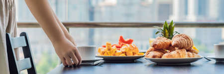Young woman is laying on a table Breakfast table with coffee fruit and bread croisant on a balcony against the backdrop of the big city. BANNER, LONG FORMAT