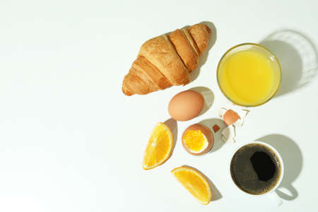Morning breakfast coffee and croissant, butter, orange juice and flowers on white background. Flat lay, top view