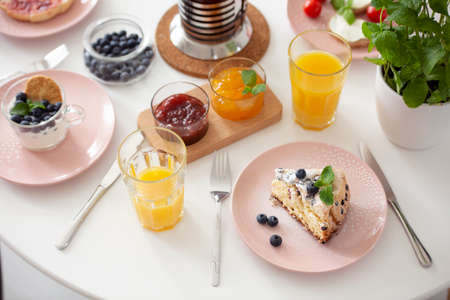 High angle on table with dessert, orange juice and marmalade during breakfast. Real photo