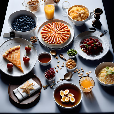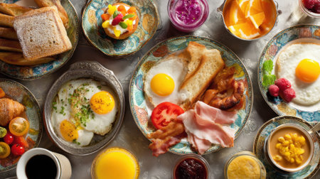 Delicious variety of breakfast dishes with eggs, fruits, and beverages.