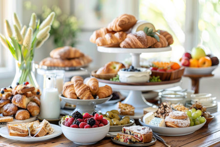 Opulent and Diverse Breakfast Spread on a Wooden Table, Featuring Fresh Croissants, Scrambled Eggs, Bacon, Berries, and Cheese in a Bright Setting.