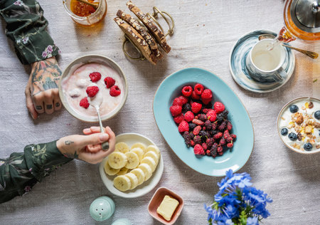 Healthy breakfast table set. Sunday summer morning. Toned image