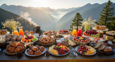 A table displays a diverse breakfast buffet. Assortments of pastries, fruits, and juices are arranged alongside silverware and plates. The composition features soft lighting and a blurred mountain background, suggesting an outdoor setting. This image is suitable for culinary, lifestyle, and travel-related visual content.