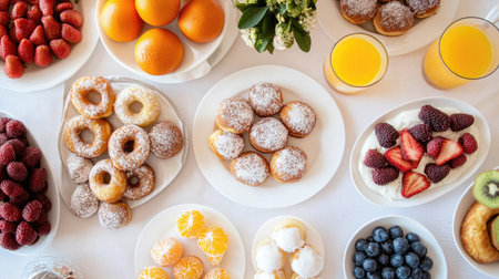 A delightful breakfast spread with assorted donuts, fresh fruit, and a glass of orange juice, arranged on a white tablecloth.