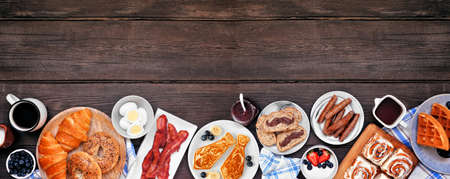Food and drink, healthy morning eating concept. Breakfast assortment with pancakes, waffles, croissant sandwich and granola with yogurt on the kitchen table. Top view flat lay copy space background