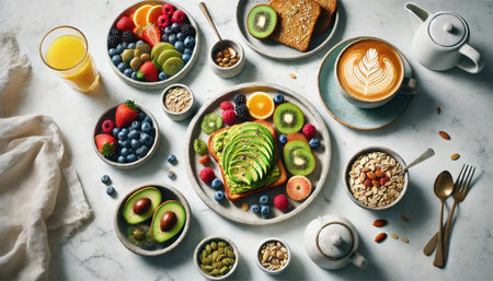Morning breakfast on a table above, waffles with cream, berries, coffee, cappuccino, bowl, omlet with vegetables, bread with butter, avocado cream, vegan food, healthy food, meal.