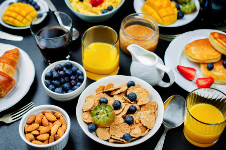 Breakfast table setting with flakes, juice, croissants, pancakes and fresh berries. toning. selective focus
