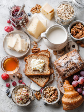 A table for a healthy breakfast with rye whole-grain bread, butter, granola, fresh berries, honey, porridge and croissants . Top view.