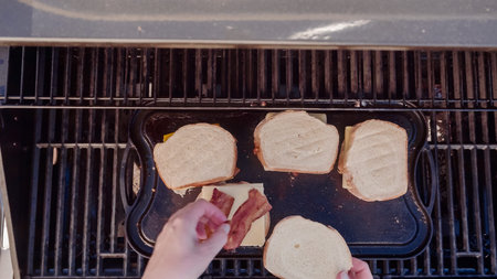 Grilling grilled cheese sandwich with bacon strips and fresh tomato on outdoor gas grill.
