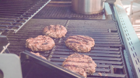 Grilling classic burgers on outdoor gas grill in the Summer.