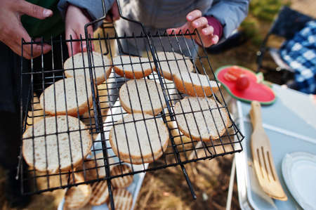 Toast is fried over charcoal. BBQ grill. Cooking crispy, tasty croutons over the fire