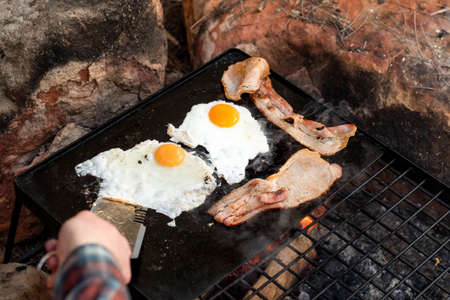 Breakfast camp cooking, Grilling eggs and bacon on the bbq plate with beautiful nature landscape on background.
