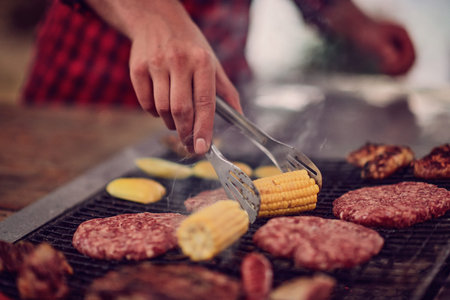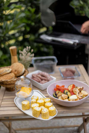 Grilling burger patties and buns outdoors with corn on summer day.