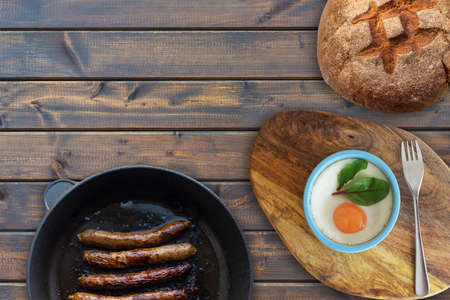 Pan-fried sausages and scrambled eggs served with bread on a wooden table, top view. free space for text.