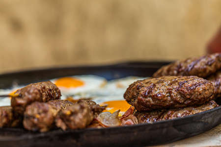 Homemade delicious american Breakfast with sausages and ham on wooden cut board. Nutritious, tasty, healthy food.