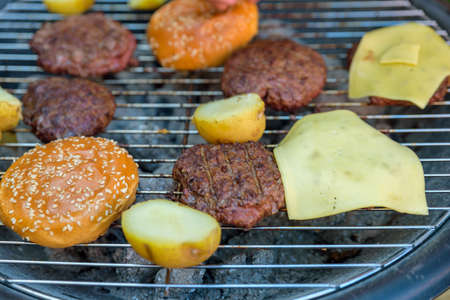 Cooking delicious juicy meat burgers and buns on the grill outdoor. Selective focus