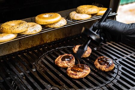 Cooking a burger on the grill. Spreading sauce on a burger bun. Grilled roasted buns