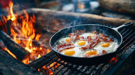 Crispy bacon strips and softly scrambled eggs sizzling in a seasoned cast iron pan, illuminated by flickering flames and drifting smoke in a cozy outdoor setting.