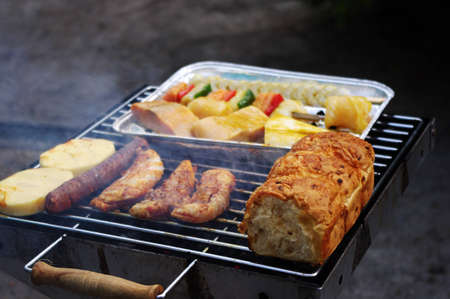 Meat, fish, bread and cheese on the barbecue grill.