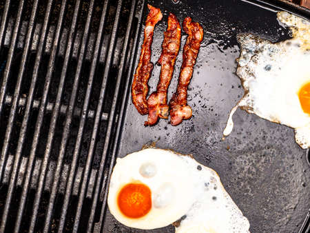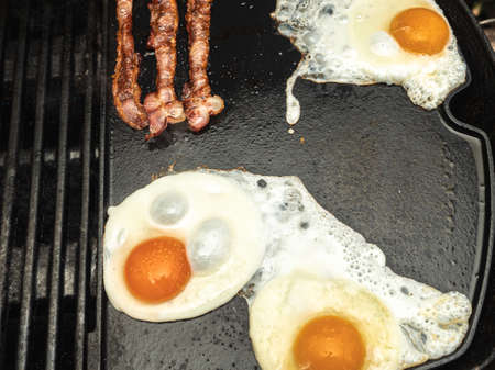 Eggs and stripes of fresh bacon are cooked ona cast iron griddle outside on a sunny day. Top shot.