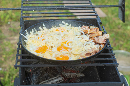 Fried eggs in a frying pan fried on a grill outdoors