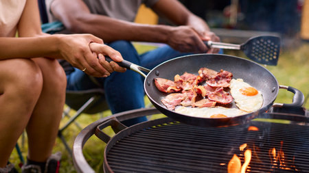 Close Up Of Couple Camping In Countryside With RV Cooking Bacon And Eggs For Breakfast On Fire