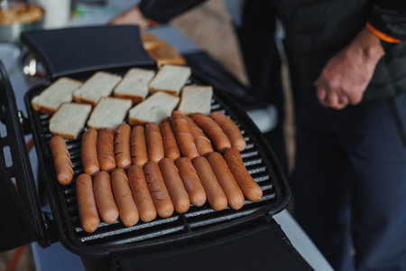 A closeup view of mouthwatering hot dogs and fresh bread sizzling on a grill for an ideal outdoor barbecue experience