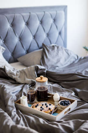 Christmas morning, Valentines day, cozy morning, horel room - breakfast in bed, wooden tray with coffee, muffins, orange juice on the bed. Modern minimal scandinavian bedroom interior. Copy space.