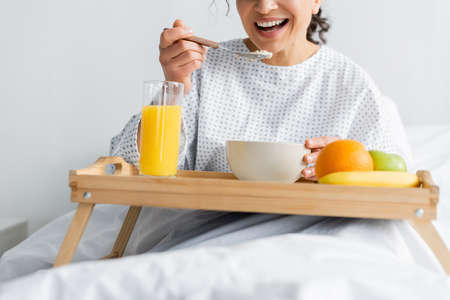 cropped view of smiling african american woman having breakfast in hospital on blurred foreground