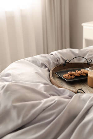 Delicious cookies and cup of coffee on bed with stylish silky linens indoors, space for text