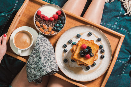 Cozy breakfast in bed from above, yogurt bowl with berries, nuts, french toasts, coffee cup on wooden plate, woman legs