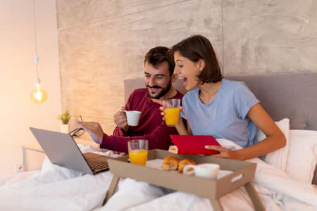Beautiful young couple in love wearing pajamas, having fun reading and surfing the net using laptop computer while having breakfast in bed