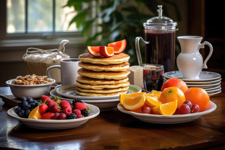 pancake breakfast setup with coffee and fruit, created with generative ai