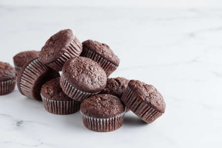 A close up of chocolate muffins. Chocolate muffins in selective focus with copy space at the back