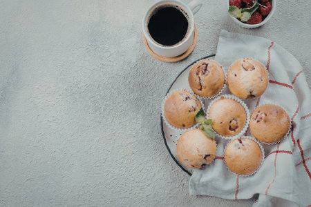 Black aromatic coffee with a fresh muffin and raspberries for Breakfast