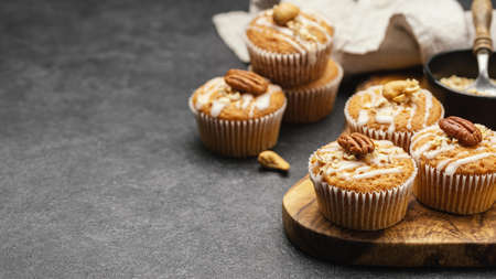 Healthy vegan homemade carrot or pumpkin muffins with raisin and nuts, light concrete background.