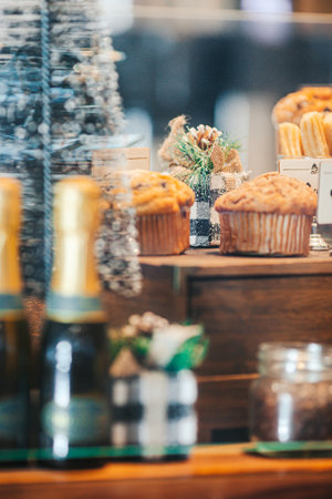 Sweet muffin pastry with chocolate and blueberries in cafe and bakery. Puff mini cakes at patisserie. Food for breakfast. Fresh baked buns for desert. Gourmet and cuisine. Homemade quick bread