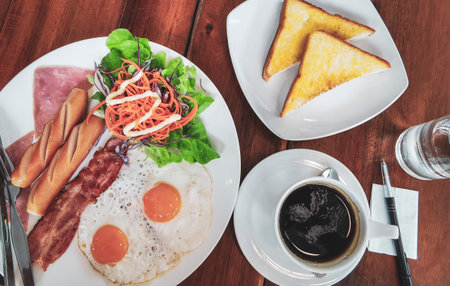 Intercontinental breakfast with sausages toast eggs salad bacon and a cup of coffee on a plate in a restaurant in Patong Beach Kathu District Phuket Island Province Southern Thailand.