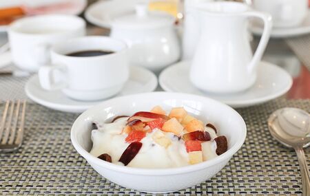 Healthy breskfast of bowl with fresh fruits salad and yoghurt
