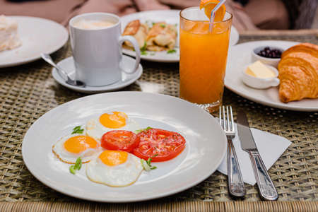 Tasty breakfast in the early morning in a summer cafe. Sunny bright light. June