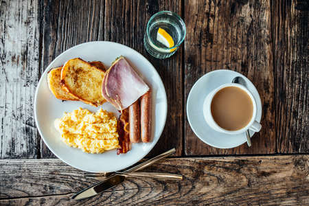 American Breakfast with bacon , scrambled egg on wood background