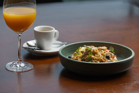 Bowl of yogurt with muesli and fruits cream cheese and orange juice, arranged on a table and illuminated by the light of a window, creating an effect of light and shadow.