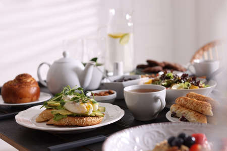 Delicious sandwiches with eggs and avocado served on buffet table for brunch