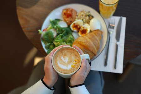 Woman having tasty breakfast in cafe, top view